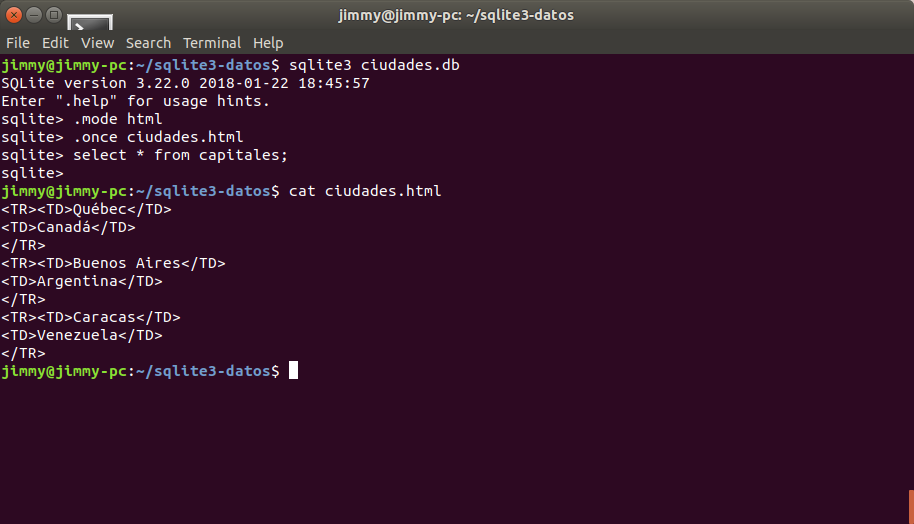 Una consideración final: para poder exportar este código HTML debemos indicarle primero a SQLite3 que entre en modo de salida a un fichero concreto, pongamos uno llamado «ciudades.html»: