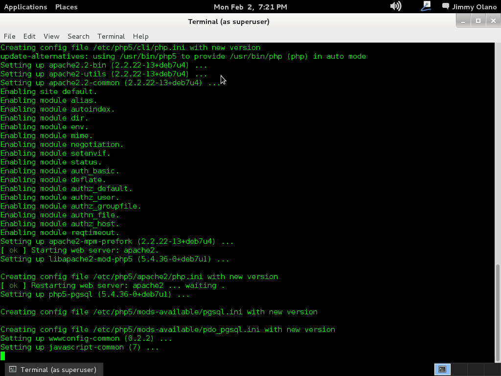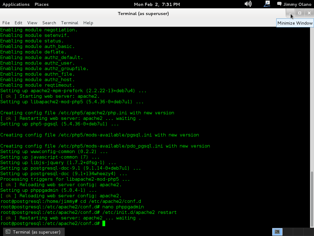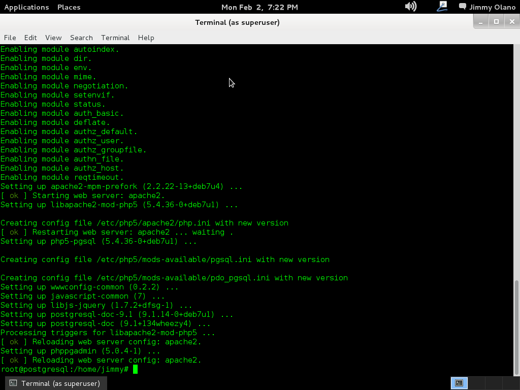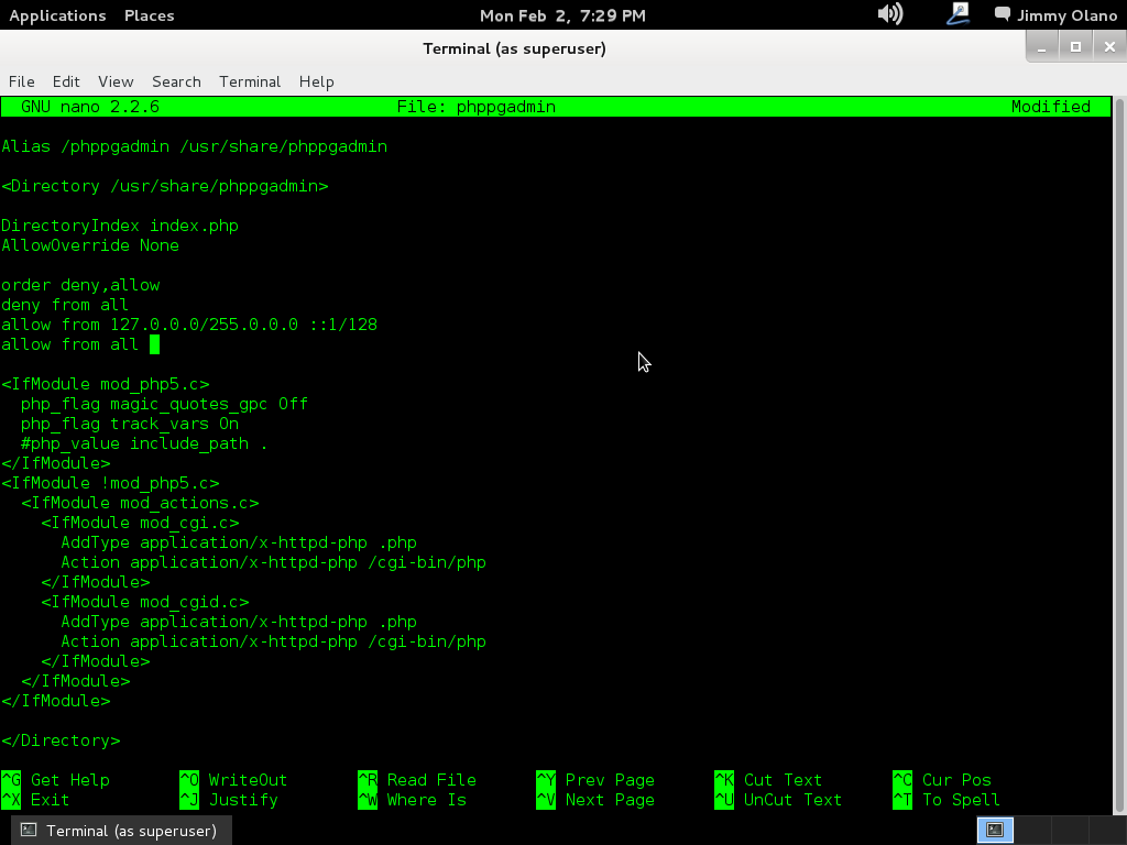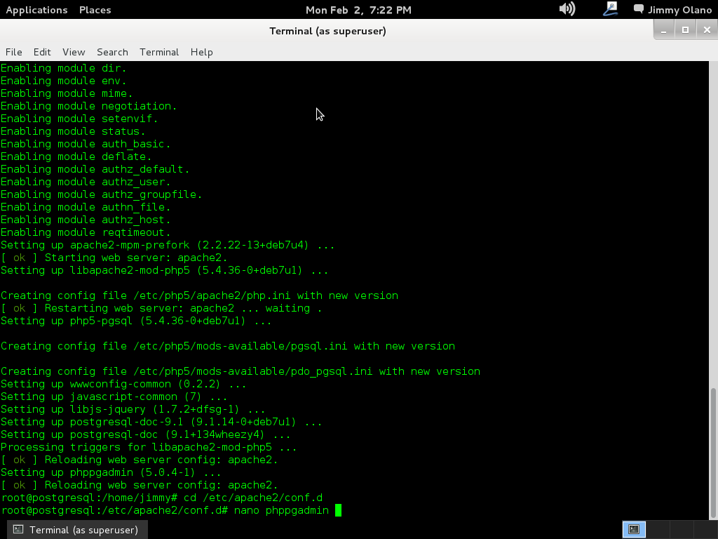 Al finalizar la instalación podemos configurar el phpPgAdmin para que admita conexiones desde cualquier computadora, por seguridad viene sólo para sea administrado directa y únicamente por cónsola de la máquina, así que:
