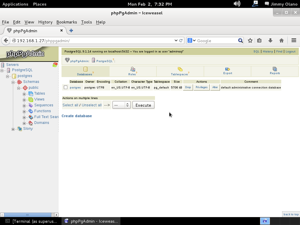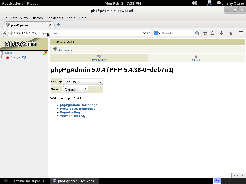 Esta última captura de pantalla, tal y como se los describí en la entrada origen a este trabajo, es la máquina real que contiene a la máquina virtual en la cual está alojada la máquina virtual cuyo nuestro enrutador de red inalámbrico le asignó la dirección 192.168.1.27 y utilizamos Iceweasel que es el navegador web predeterminado en Debian. Luego procedemos a verificar si el phpPgAdmin está corriendo al introducir en la barra de direcciones el siguiente comando: