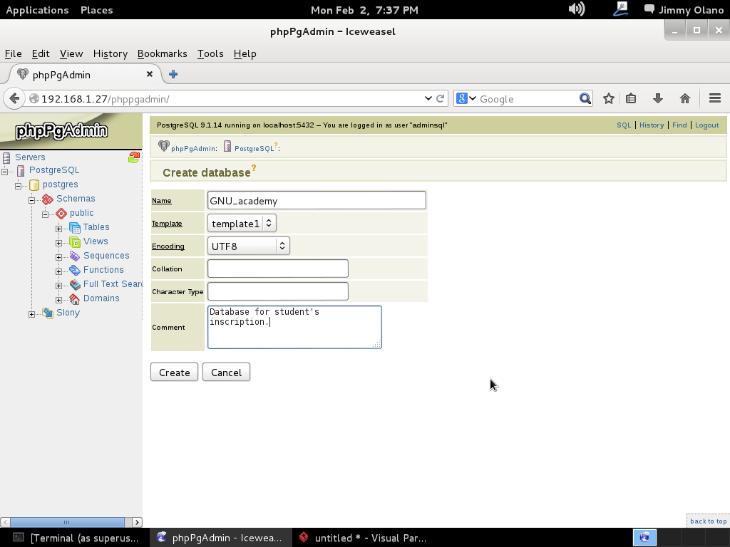 Le colocamos el nombre «GNU_academy» en el «encoding» seleccionamos «UTF8» para que acepte nuestros caracteres castellanos («ñÑáÁéÉíÍóÓúUüÜ») y no se preocupen por «Collation» que automáticamente toma la configuración regional del sistema.