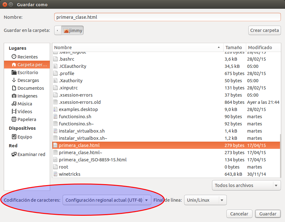 Volviendo a nuestro archivo de texto plano con extensión .html y editado con el programa gedit debemos tener especial cuidado en guardar dicho archivo en la codificación de caracteres utf-8 tal como muestro al escoger la opción «Guardar como», les resalto con una elipse para acentuar la opción: