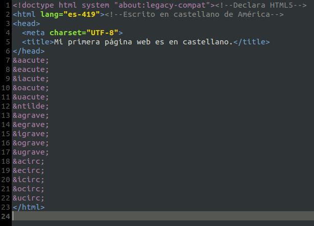 Si insertamos los anteriores caracteres «especiales» (no usados en el idioma inglés) en nuestra primera página web, la guardamos y abrimos con nuestro navegador web (y pedimos visualizar nuestro código fuente) veríamos algo similar a esto en el programa gedit: