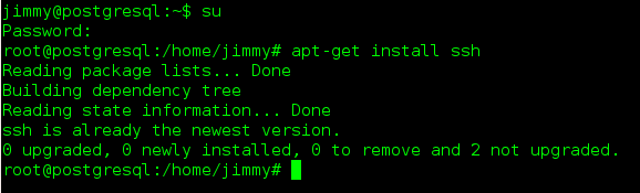 Si solamente colocamos «ssh usuario@máquina» (y por supuesto introducimos nuestra contraseña  de usuario de la máquina remota) quedará la ventana terminal abierta para teclear los comandos que necesitemos, eso sí, cambiando el prompt o indicador (para nuestro ejemplo «jimmy@posgresql:~$«) para que sepamos dónde estamos ubicados.