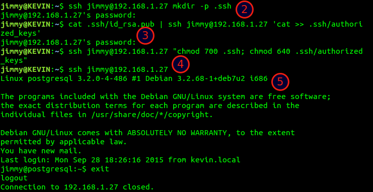 cat .ssh/id_rsa.pub | ssh jimmy@192.168.1.27 'cat >> .ssh/authorized_keys'