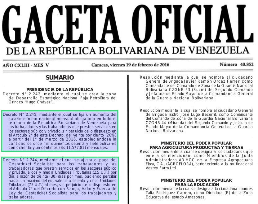 Se debe recalcar que, en el mismo ejemplar de gaceta, se encuentra publicado el Decreto Presidencial N° 2.244 el cual establece el aumento de la Ley de Cestaticket Socialista de una unidat tributaria y media (1,5 U.T.) diarias a dos unidades tributarias y media (2,5 U.T.) diarias POR ESCRITO y no como declaró el Presidente en transmisión conjunta de radio, televisión e internet -error que ha cometido ya varias veces- de tratarlo como porcentaje (sic) «de 1,5% a 2,5%», vaya ese detalle por delante.