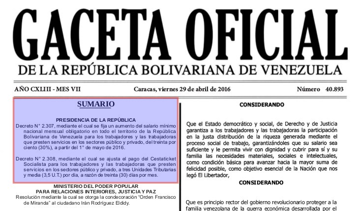 Gaceta Oficial N° 40.893: aumento sueldo 30% 1° mayo 2016.