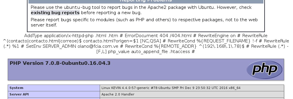 Vale decir que este comando php_value bien puede estar ubicado ya sea en «PHP config», «virtualhost settings» o en un archivo .htaccess que es el caso que nos ocupa y más específicamente el valor auto_append_file porque coloca al final de nuestra página web (en este ejemplo didáctico el archivo index.html que trae por defecto Apache al ser instalado) los valores que tengamos en nuestro archivo hosts con la siguiente instrucción: