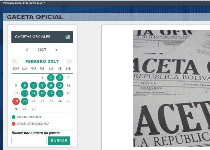 A la fecha de hoy el Tribunal Supremo de Justicia, en su apartado de publicaciones de la Gaceta Oficial de la República Bolivariana de Venezuela tiene solamente hasta el día lunes 20 de febrero (se ve que el carnaval hizo mella en el trabajo administrativo):