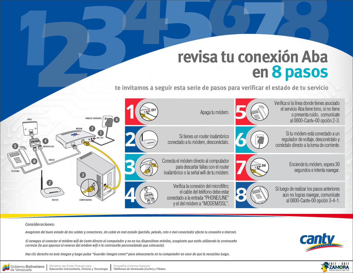 Una vez comprobado todo esto, lo siguiente será conectar el módem, confirmar que la luz de energía («power LED») encienda para luego fijarnos si «engancha» con CANTV cuando la luz de ADSL queda encendida de manera fija. Algunos módem tienen otra luz para indicar que hay tráfico de Internet, esta siempre debe parpadear si hay tráfico de datos.