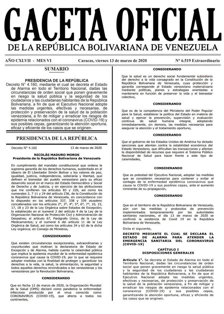 Decreto Nº 4.160, mediante el cual se decreta el Estado de Alarma en todo el Territorio Nacional, dadas las circunstancias de orden social que ponen gravemente en riesgo la salud pública y la seguridad de los ciudadanos y las ciudadanas habitantes de la República Bolivariana, a fin de que el Ejecutivo Nacional adopte las medidas urgentes, efectivas y necesarias, de protección y preservación de la salud de la población venezolana, a fin de mitigar y erradicar los riesgos de epidemia relacionados con el coronavirus (COVID-19) y sus posibles cepas, garantizando la atención oportuna, eficaz y eficiente de los casos que se originen.