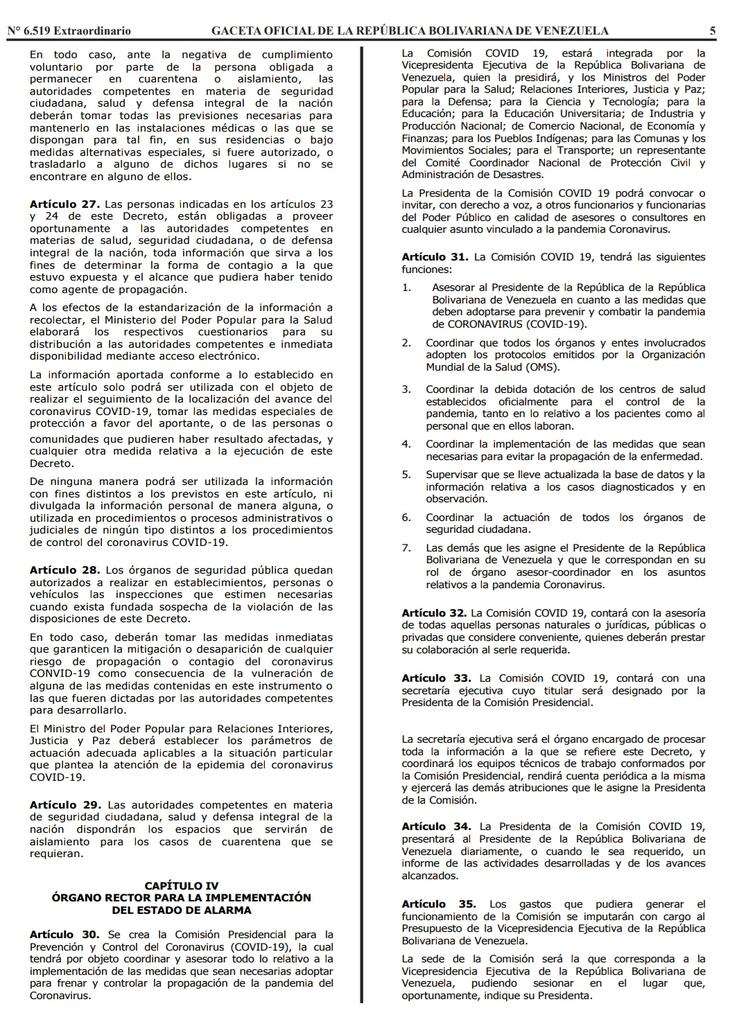 Se decreta el Estado de Alarma en todo el Territorio Nacional, dadas las circunstancias de orden social que ponen gravemente en riesgo la salud pública y la seguridad de los ciudadanas y las ciudadanos habitantes de la República Bolivariana, a fin de que el Ejecutivo Nacional adopte las medidas urgentes, efectivas y necesarias, de protección y preservación de la salud de la población venezolana, a fin de mitigar y erradicar los riesgos de epidemia relacionados con el coronavirus (COVID-19) y sus posibles cepas, garantizando la atención oportuna, eficaz y eficiente de los casos que se originen.