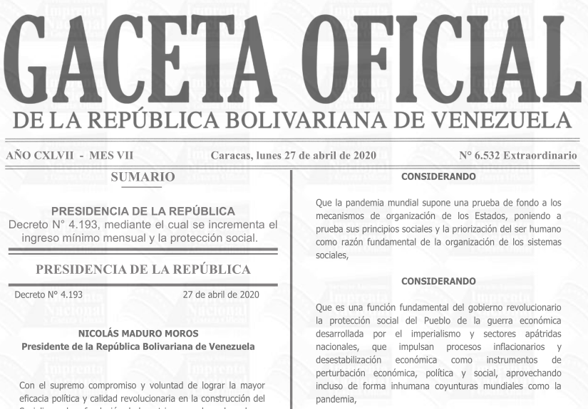 Gaceta Oficial Extraordinario N° 6.532: aumento de sueldo 1 mayo 2020.