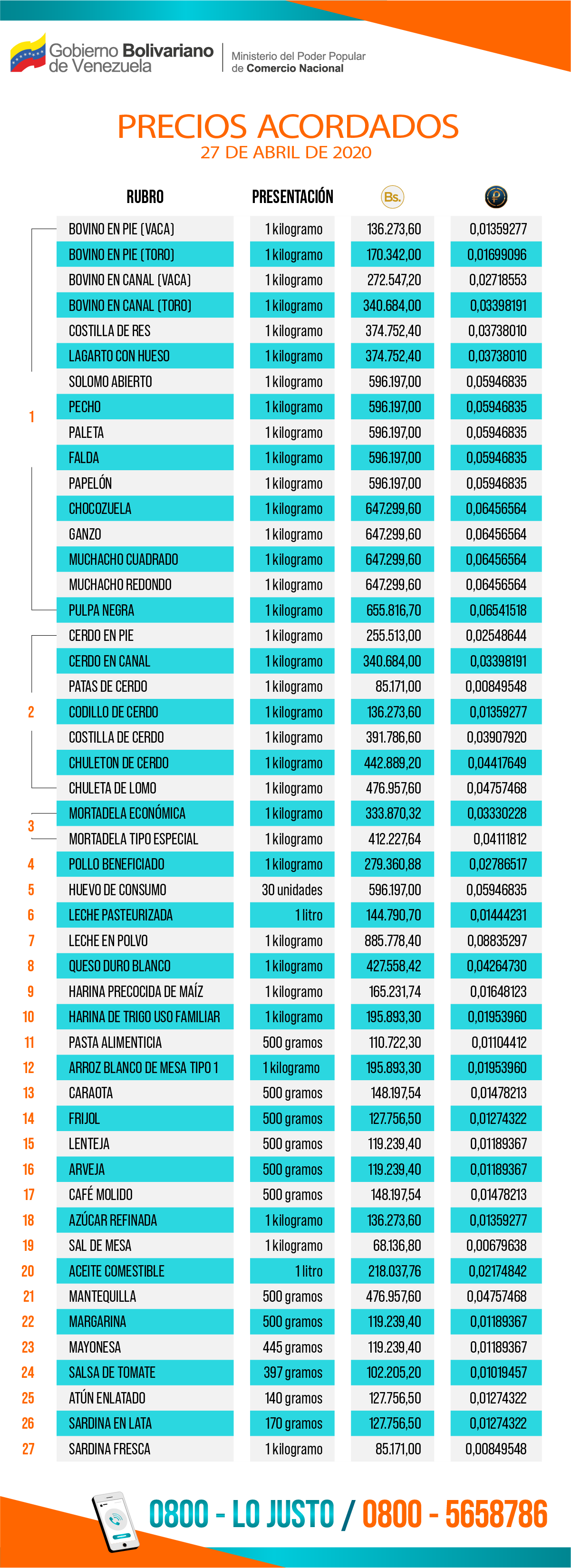 El 27 de abril de 2020 el Ministerio del Poder Popular del Comercio Nacional publicó en su página web la lista de precios máximos acordados entre productores, importadores, comerciantes y el ejecutivo nacional, dichos precios están en función del valor del Petro.