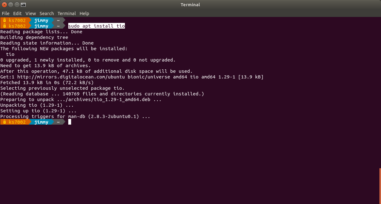 A lo largo de los años, he usado diferentes herramientas, como Minicom y Screen. Tio es una herramienta más nueva y simple descrita como «una simple aplicación de E/S de terminal TTY». Está disponible en la mayoría de las distribuciones de Linux, FreeBSD y OpenWRT, así como en un paquete de Snap para su instalación. Yo utilicé la herramienta del paquete estándar para instalar la versión 1.32 en mi servidor Red Hat Enterprise Linux 8.1: