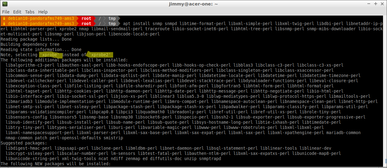 snmp snmpd libtime-format-perl libxml-simple-perl libxml-twig-perl libdbi-perl libnetaddr-ip-perl libhtml-parser-perl wmi-client xprobe2 nmap libmail-sendmail-perl traceroute libio-socket-inet6-perl libhtml-tree-perl libsnmp-perl snmp-mibs-downloader libio-socket-multicast-perl libsnmp-perl libjson-perl libencode-locale-perl
