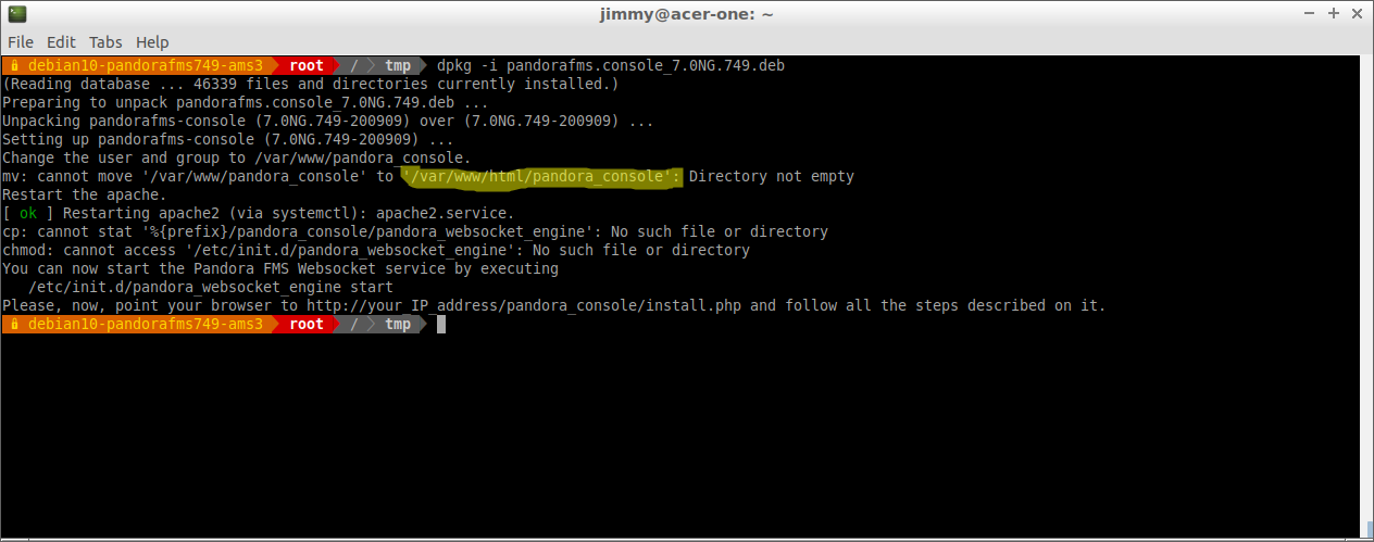 Acá hago una pausa, en la imagen anterior el guión de instalación nos muestra un mensaje importante, que no pudo mover a la ubicación por defecto a la consola PFMS. Recordemos que estamos utilizando un subdominio con virtual hosts en Apache Web Server, el cual fue instalado junto con la consola.