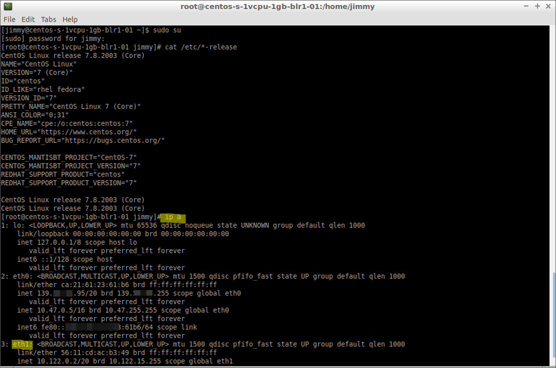 Con propósito didáctico en las siguientes imágenes están resaltados los aspectos más importantes. Para esta practica la interfaz de red escogida es eth1 la cual está conectada a una red privada virtual en un servidor virtual con Centos 7.