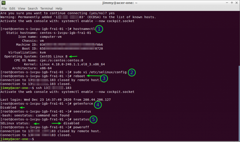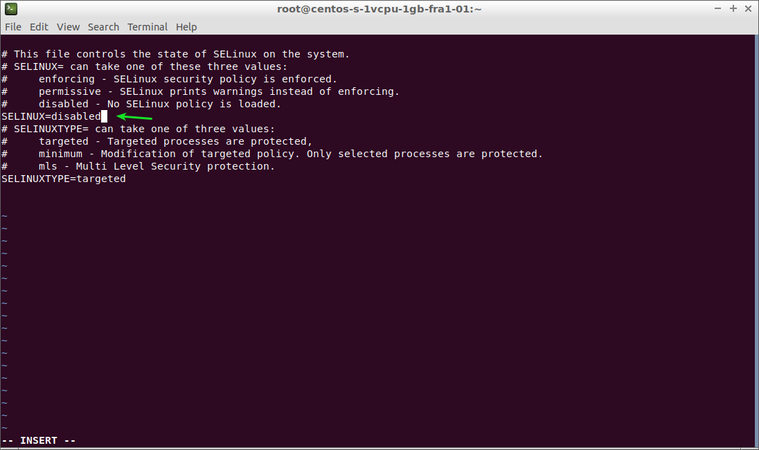 Esto último es lo que debemos cambiar para luego reiniciar la máquina y comprobar que fue realmente deshabilitado SELinux: