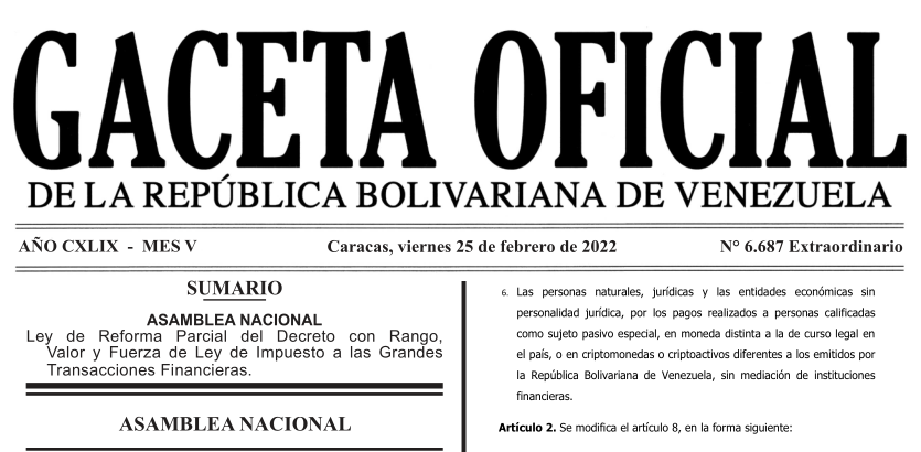 Ley de Reforma Parcial del Decreto con Rango, Valor y Fuerza de Ley de Impuesto a las Grandes Transacciones Financieras Publicada el miércoles, 09 de marzo de 2022 | por Jimmy Olano Tweet https://t.co/9AHo8e05hPLey de Reforma Parcial del Decreto con Rango,Valor y Fuerza de Ley de Impuesto a las GrandesTransacciones Financieras.(difunde @DesarrollosPnP )— ks7000.net.ve💾🇻🇪😷🏡 (@ks7000) 9 de marzo de 2022 Gaceta Oficial ejemplar Extraordinario Nº 6687 (sumario) TweetPor favor, lea también Gaceta Oficial N° 40.597: aumento 15% sueldo 1° febrero 2015.Powered by Inline Related Posts