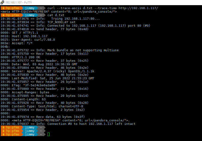 Muchas veces se preguntará cuánto tiempo exactamente toma la consulta, o simplemente quiere saber la cantidad de milisegundos entre dos puntos en una transferencia. Para esas y otras situaciones similares, la opción --trace-time es lo que necesita. Antepondrá la hora a cada línea de salida de seguimiento:
