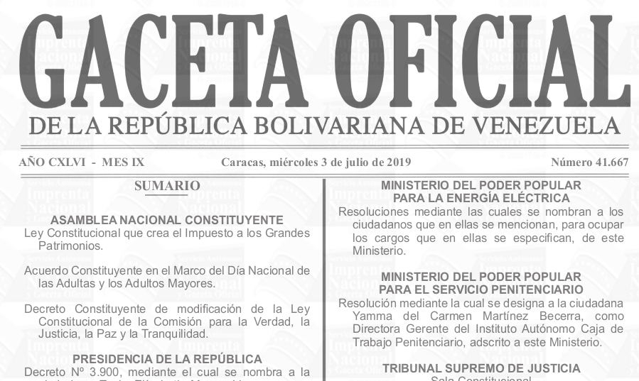 También colocamos a vuestra disposición la Providencia del SENIAT SNAT/2019/00213 (con su copia histórica) con las «Normas de actualización del valor de bienes y derechos, así como los requisitos y formalidades para la declaración y pago del Impuesto a los Grandes Patrimonios» el siguiente enlace con dicho ejemplar de la gaceta (solamente las páginas 1 y 4, cuatro megabytes y medio de la Gaceta Oficial Número 41.697 del día lunes 19 de agosto de 2019).