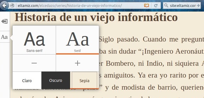 He de confesarles a todas y a todos que con el paso de los años mi vista se ha desmejorado; en el buen sentido que le damos por estos lares: «se me han quemado las pestañas». Es por ello que con gusto he utilizado «Mozilla Firefox Reader View» el cual está explicado en buen castellano en este enlace. Aunque lo traducen como «Modo Lector» me gusta más «Modo de Lectura», ya sabéis qué poético es nuestro idioma, así que visitadlo y volved para terminar de contaros la historia. Seguir leyendo
